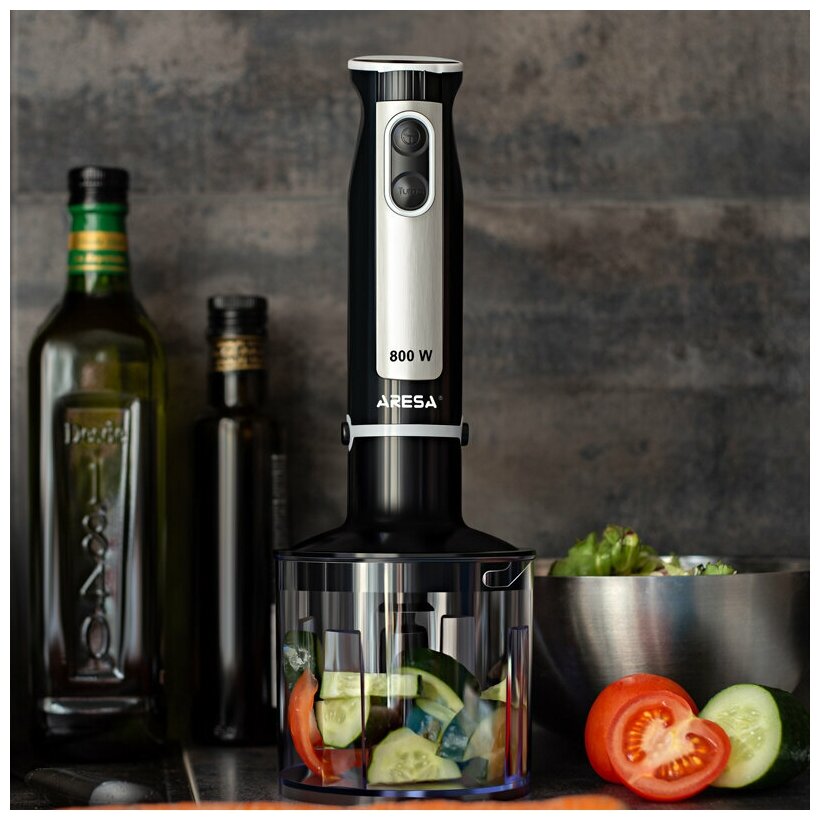 Description: Type: submersible, maximum power: 1000 W, material of the submersible part: metal, attachments: whisk for whipping, for mashing, grinder, included: measuring cup, additional functions: ice pick, smooth speed