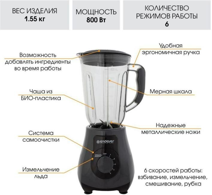 Type: stationary, maximum power: 800 W, jug material: plastic, nozzles: chopper, grinder, additional functions: ice crush, stepless speed control, self-cleaning, jug capacity: 1.50 l, quantity