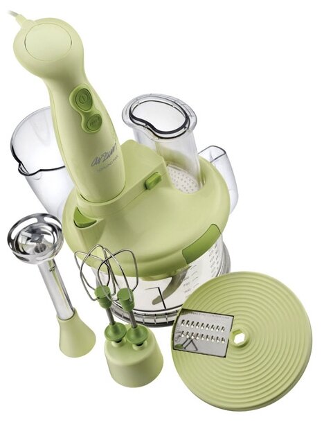 Type: submersible, maximum power: 1000 W, material of the submersible part: metal, attachments: whisk for whipping, for mashing, grinder, included: measuring cup, additional functions: ice pick, smooth speed