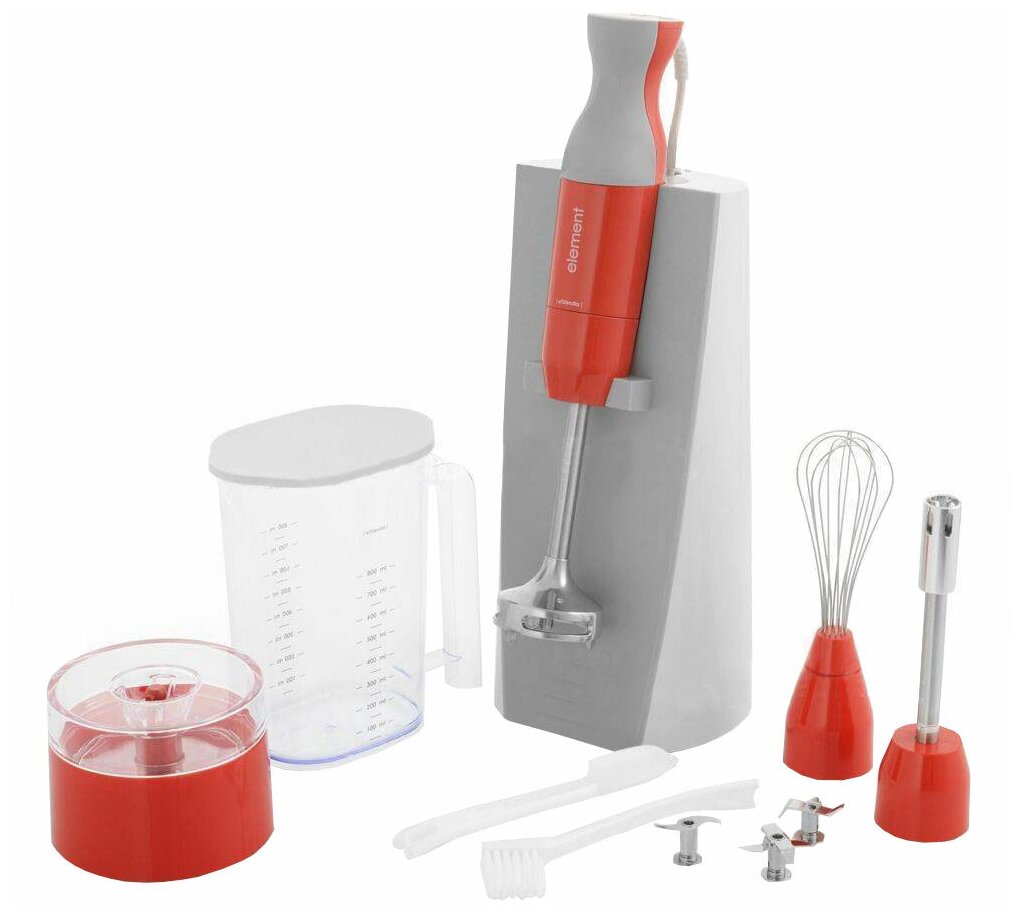Base with a place to store nozzles and cord; nozzle for sauces, for squeezing juice, knife for puree
