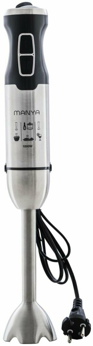 Type: submersible, maximum power: 1000 W, material of the submersible part: metal, material of the jug: plastic, nozzles: whisk for whipping, for mashing, chopper, set includes: measuring cup, additional jars