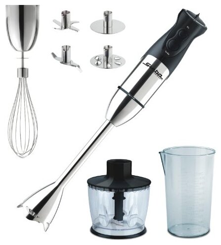 Type: submersible, maximum power: 700 W, material of the submersible part: metal, attachments: whisk, chopper, included: measuring cup, additional functions: stepless speed control, modes: turbo