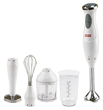 Type: submersible, maximum power: 400 W, material of the submersible part: metal, attachments: whisk for whipping, for making puree, grinder, included: measuring cup, additional functions: stepless speed adjustment