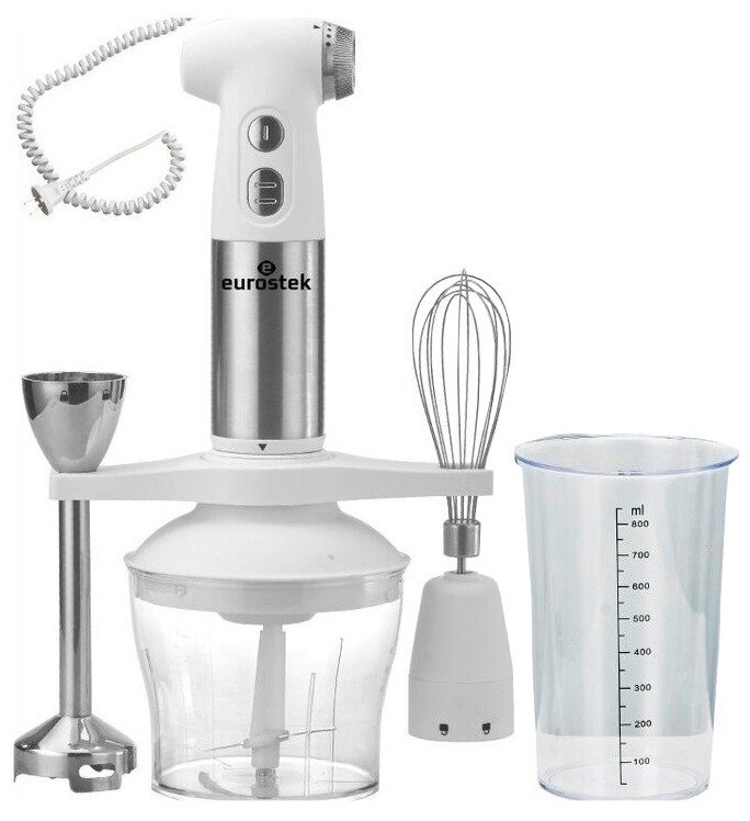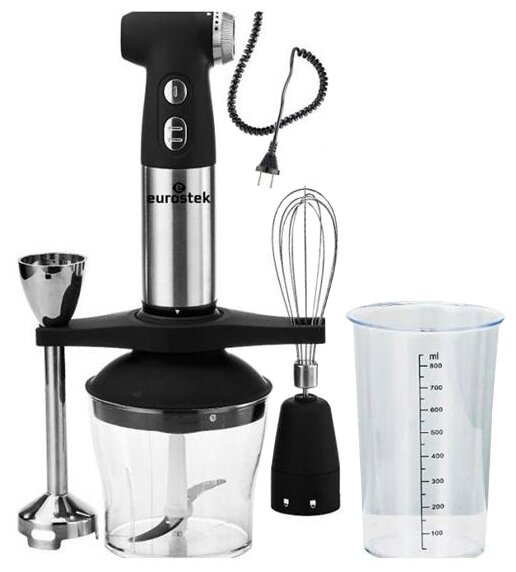 Type: submersible, maximum power: 800 W, material of the submersible part: metal, attachments: whisk, chopper, included: measuring cup, additional functions: smooth speed adjustment, modes: turbo