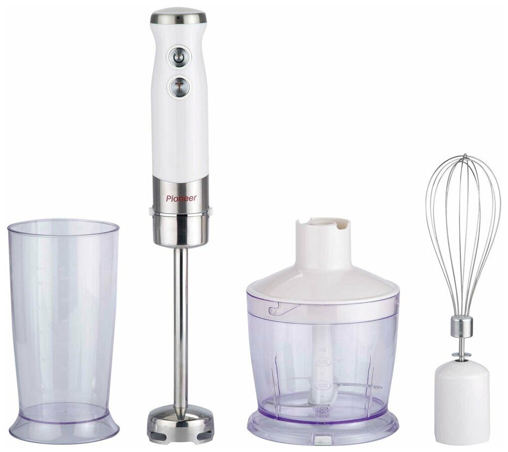 Type: submersible, maximum power: 1000 W, material of the submersible part: metal, attachments: whisk for whipping, for mashing, grinder, included: measuring cup, additional functions: ice pick, smooth speed