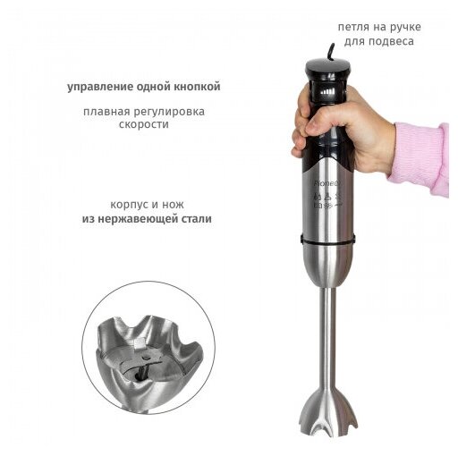Type: submersible, maximum power: 1000 W, material of the submersible: metal, jug material: plastic, attachments: whisk, slicing disc, for kneading dough, for dicing, chop