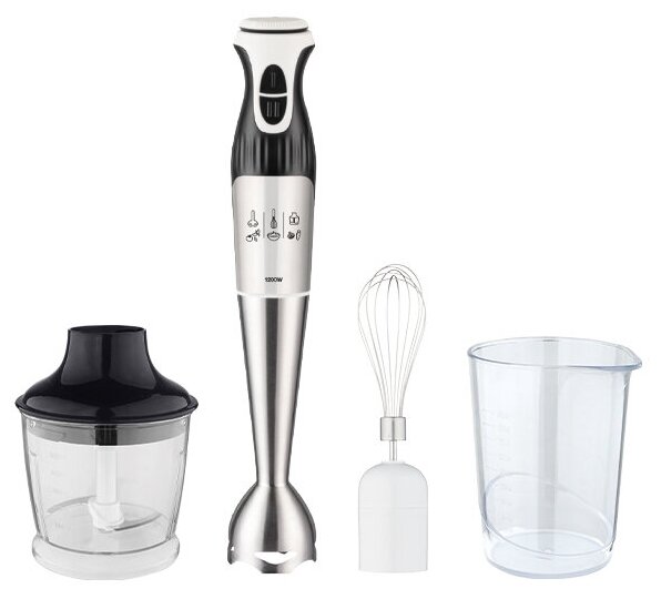Type: submersible, maximum power: 1200 W, material of the submersible: metal, attachments: whisk, chopper, included: measuring cup, weight: 1.12 kg
