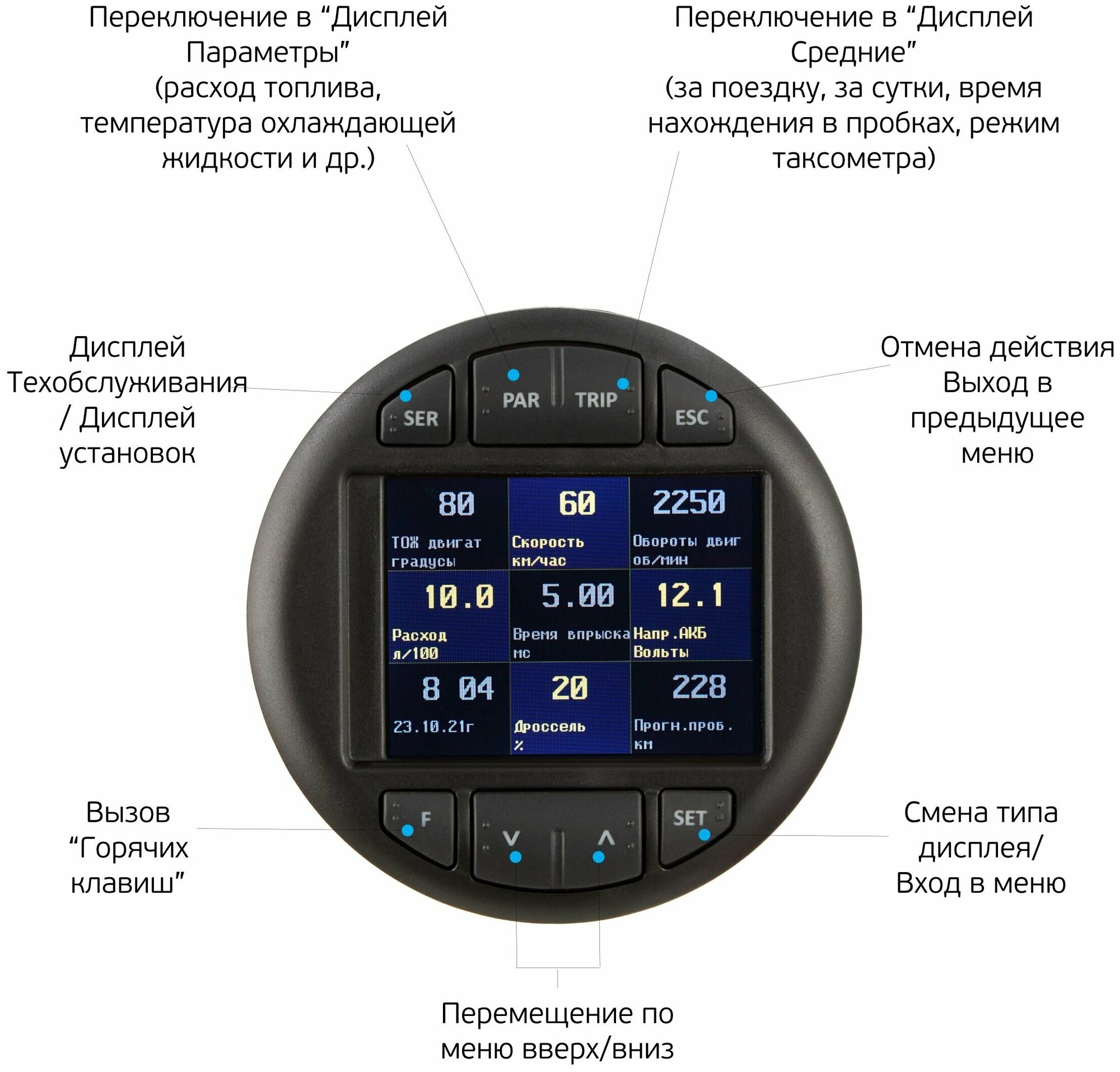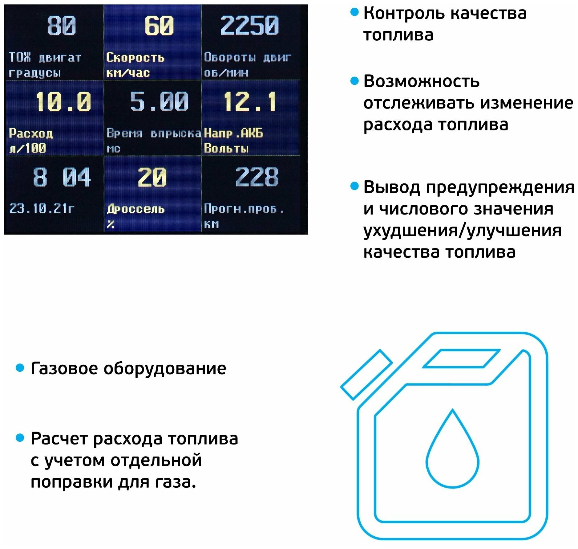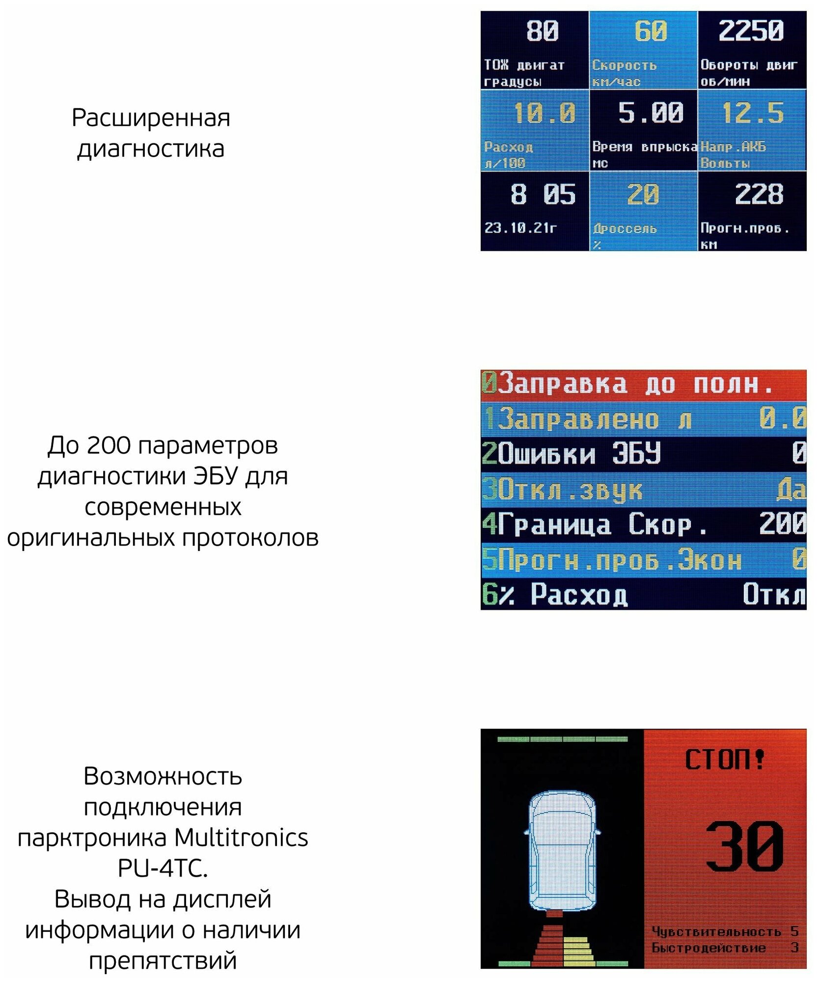 Trip computer, display: graphic, installation: on the dashboard, OBD-II, remote temperature sensor, work log, multi-display, oscilloscope