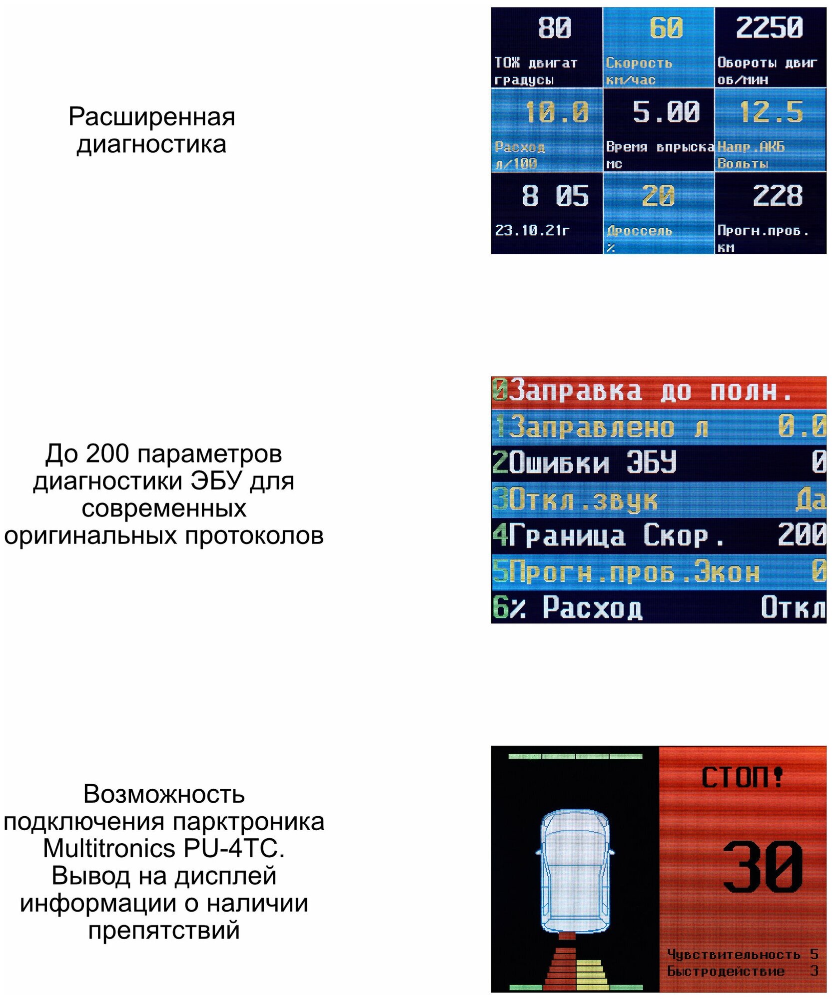 Description: Trip computer, display: graphic, installation: in a regular place, OBD-II, remote temperature sensor, work log, multi-display, oscilloscope