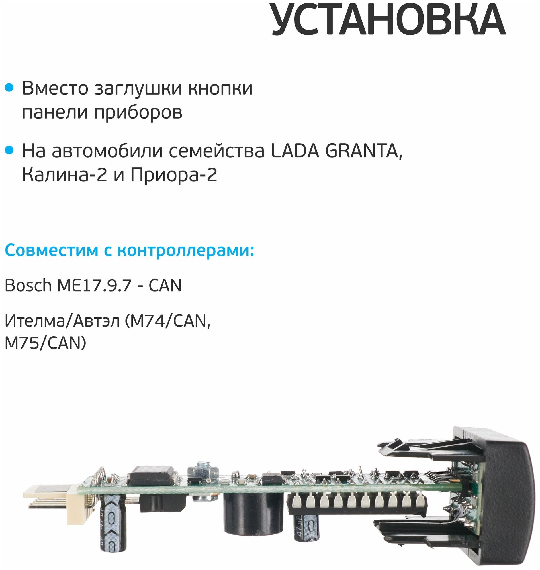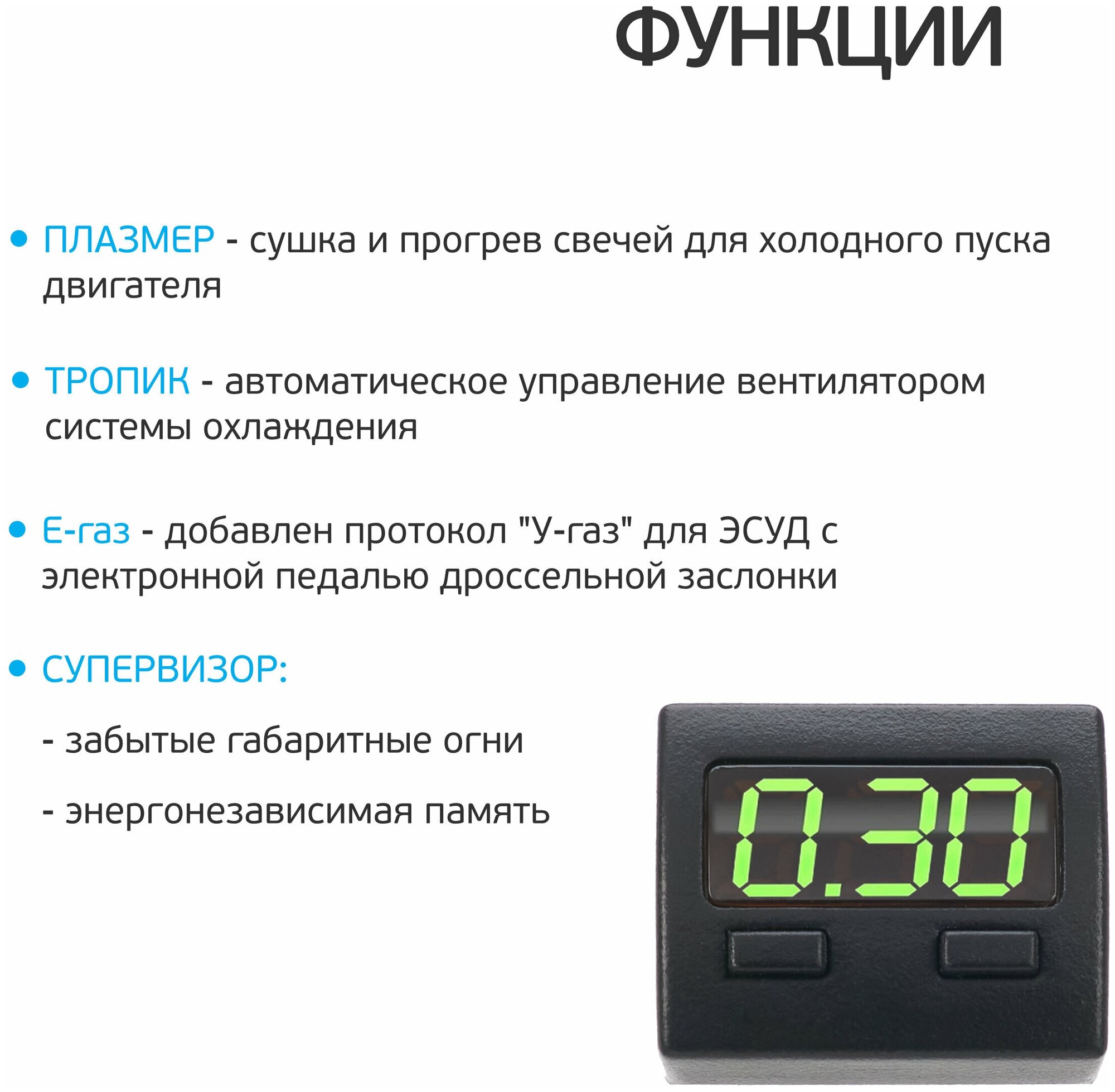 Battery voltage, resetting error codes, reading error codes, automatic control of the internal combustion engine cooling fan, drying and heating of candles