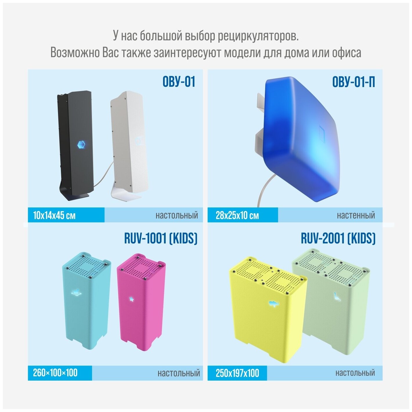 Equipped with a washable G3 class air filter; bactericidal radiation power of the lamp 4.9 W/m²; the service life of germicidal lamps is 9000 hours; bactericidal lamps operating time counter; a set of fasteners for wall mounting in a room