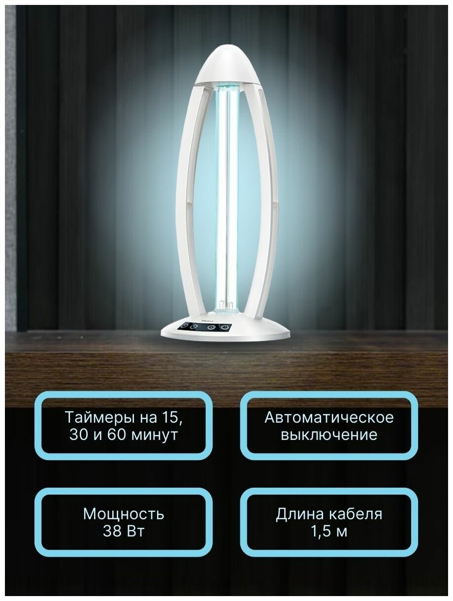Type: irradiator, purpose: indoors, installation: floor, tabletop, treated area: 60 m², features: display, operation mode indication, remote control, timer, case material: plastic, length: 110 m