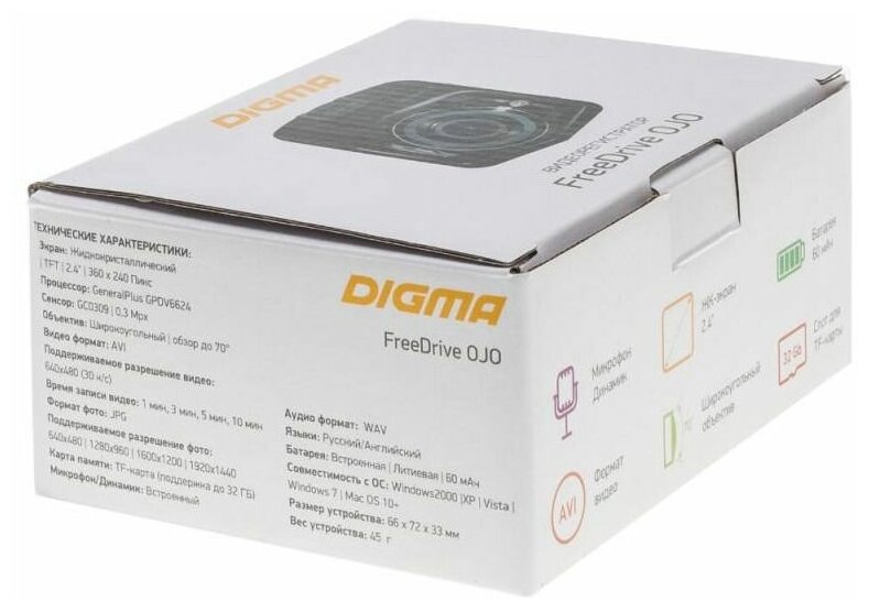 Max. video recording resolution: 640×480, design: conventional, number of cameras: 1, screen, viewing angle diagonal: 70 °, built-in microphone, recording mode: cyclic, processor: Generalplus 6624, motion detection in the frame, night mode, time and date