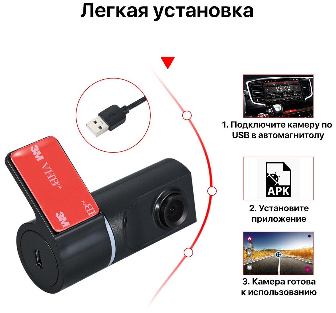 Camera DVR HD-98K for Android windshield radio, USB connection, 3m cable, 360 degree rotation