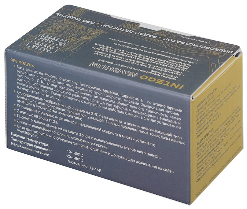 Screen resolution 320x480, K range, Ka range, X range, Laser range, types of detected radars - Arrow CT / Arena / Chris / Cordon / Gyrfalcon, modes - “ROAD” / “CITY 1” / “CITY 2” / “CITY 3 » / «SMART»