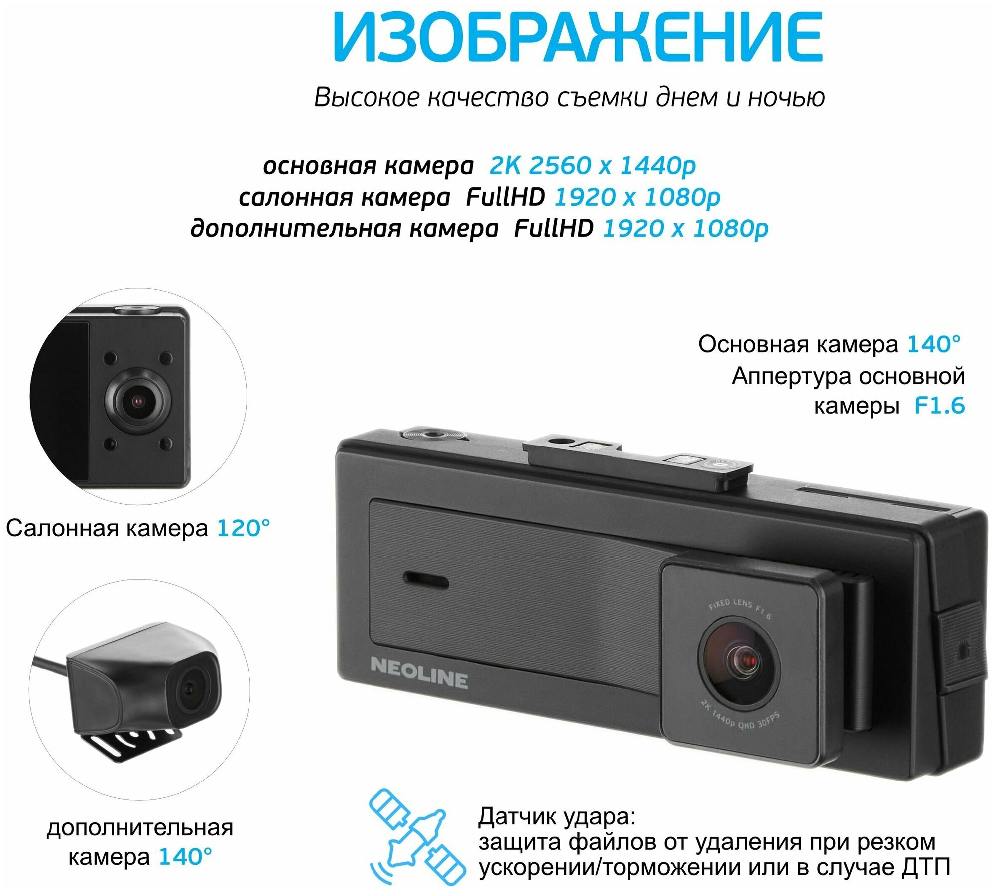 Design: conventional, number of cameras: 3, shock sensor G-sensor, screen, viewing angle diagonal: 140 °, built-in microphone, recording mode: cyclic, event recording in a separate file, night mode, time and date recording