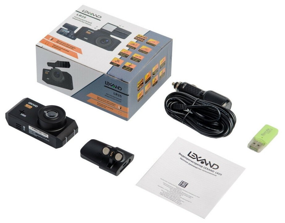 Scope of delivery: LR25 device 1 pc, car charger 1 pc, active magnetic glass holder 1 pc, removable GPS module on magnet 1 pc, TF card reader 1 pc, quick start guide in Russian with warranty card 1 pc.