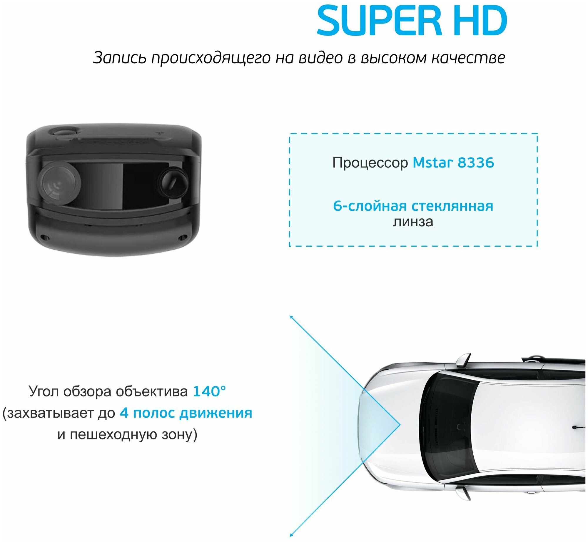 Radar detector, speedcam, max. video recording resolution: 2304 × 1296, design: conventional, number of cameras: 1, G-sensor shock sensor, screen, diagonal viewing angle: 140 °, GLONASS, built-in microphone, recording mode: cyclic, processor: MStar 8336,