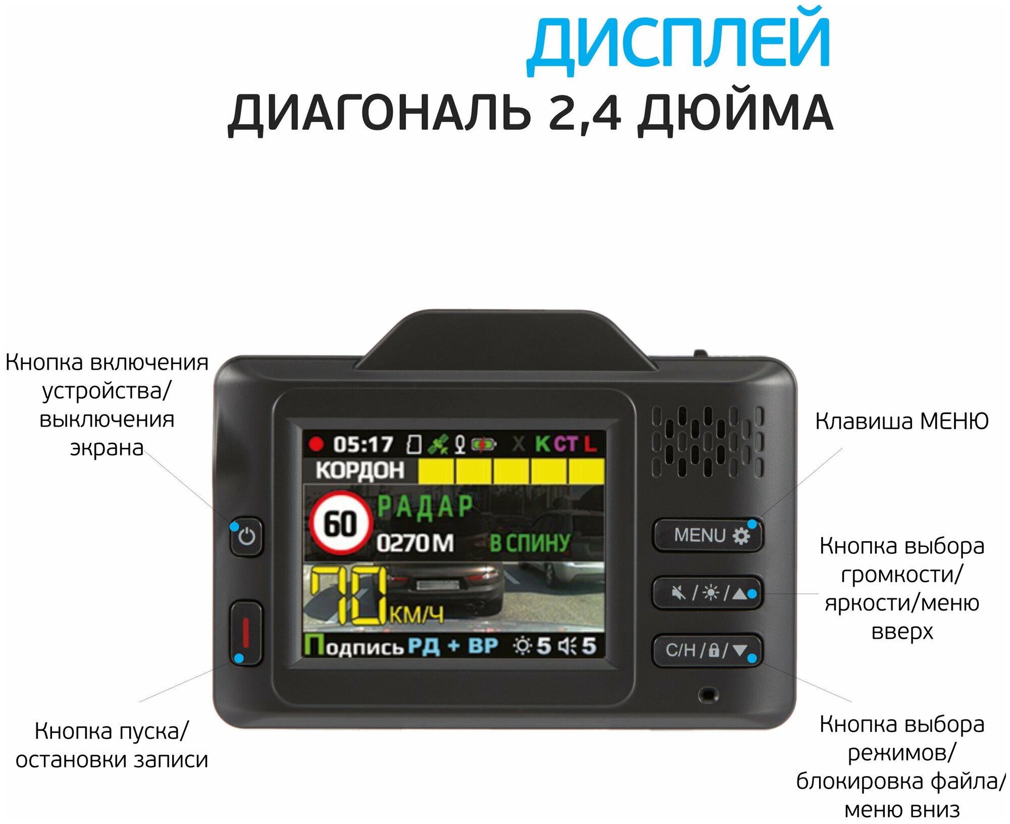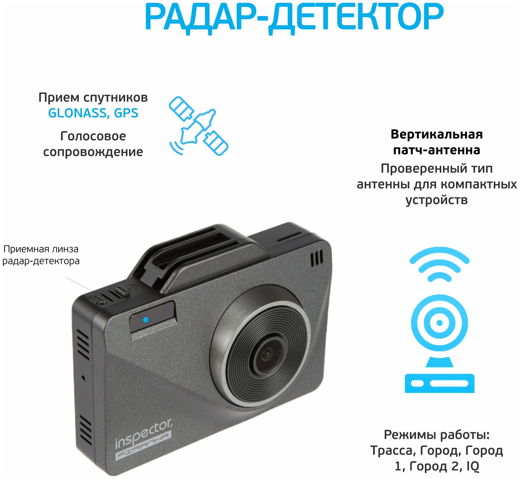 ICatch SPCA6350M processor; sensitivity modes - Highway, City, City 1, City 2, IQ intelligent mode; reception of radars STRELKA ST/M, K - 24.150 GHz ±125 MHz, X - 10.525 GHz ±50 MHz, Laser - 800-1000 nm 180°; types of control objects - control in the back