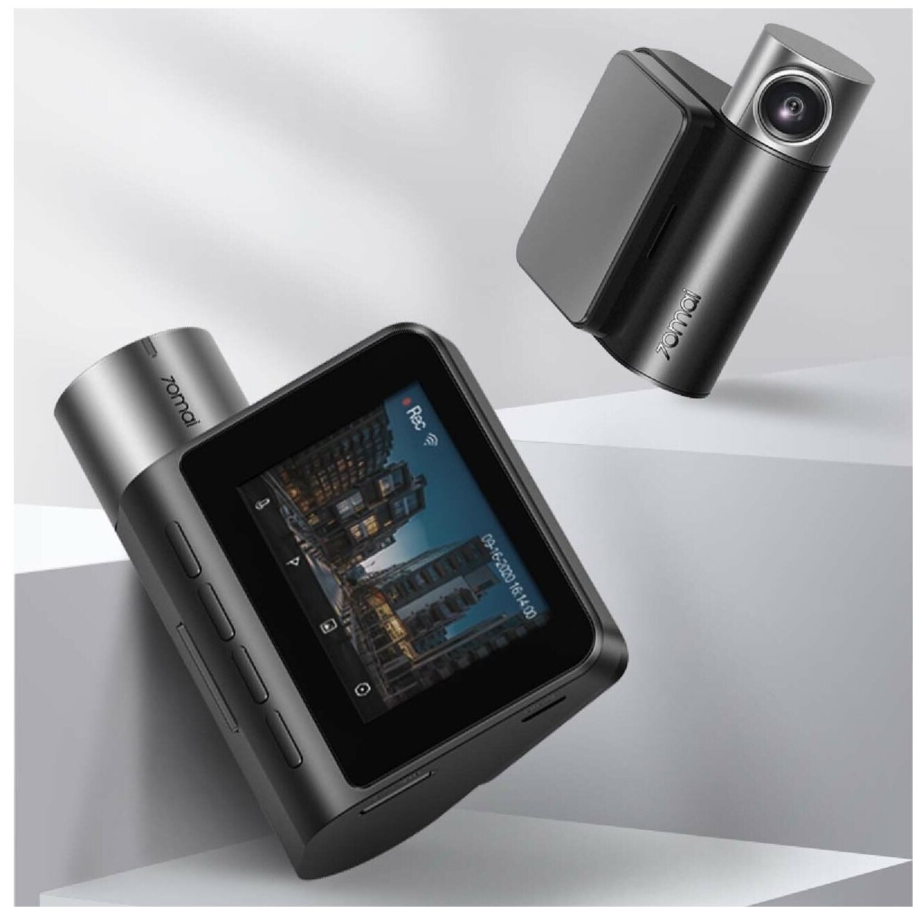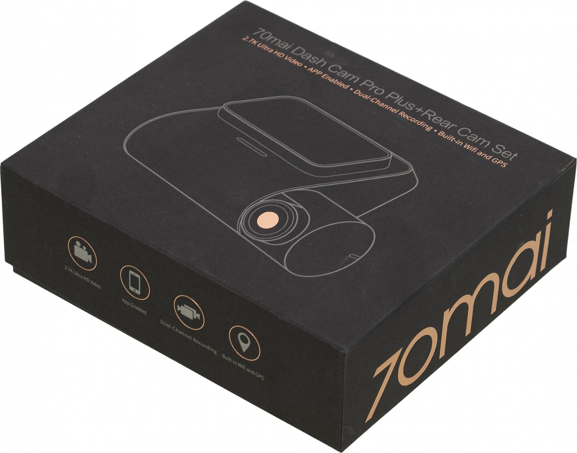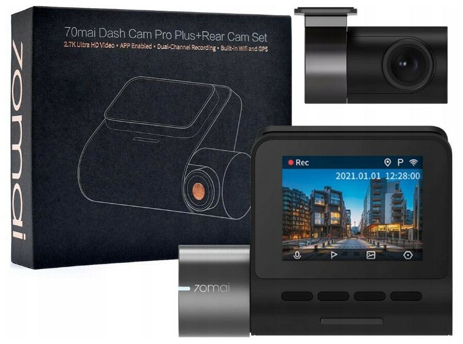 Complete set: DVR A500S-1, USB-MicroUSB power cable 5 meters long, adapter for installation in a cigarette lighter with two ports up to 3.4 A, platform with double-sided tape, spatula for laying the cable under the car trim, documentation. 70mai RC06 rear