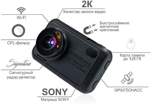 Radar detector, speedcam, max. video recording resolution: 2304 × 1296, 2304x1296, design: normal, number of cameras: 2, shock sensor G-sensor, screen, viewing angle diagonal: 170 °, GLONASS, built-in microphone, Wi-Fi, recording mode: cyclic, processor: