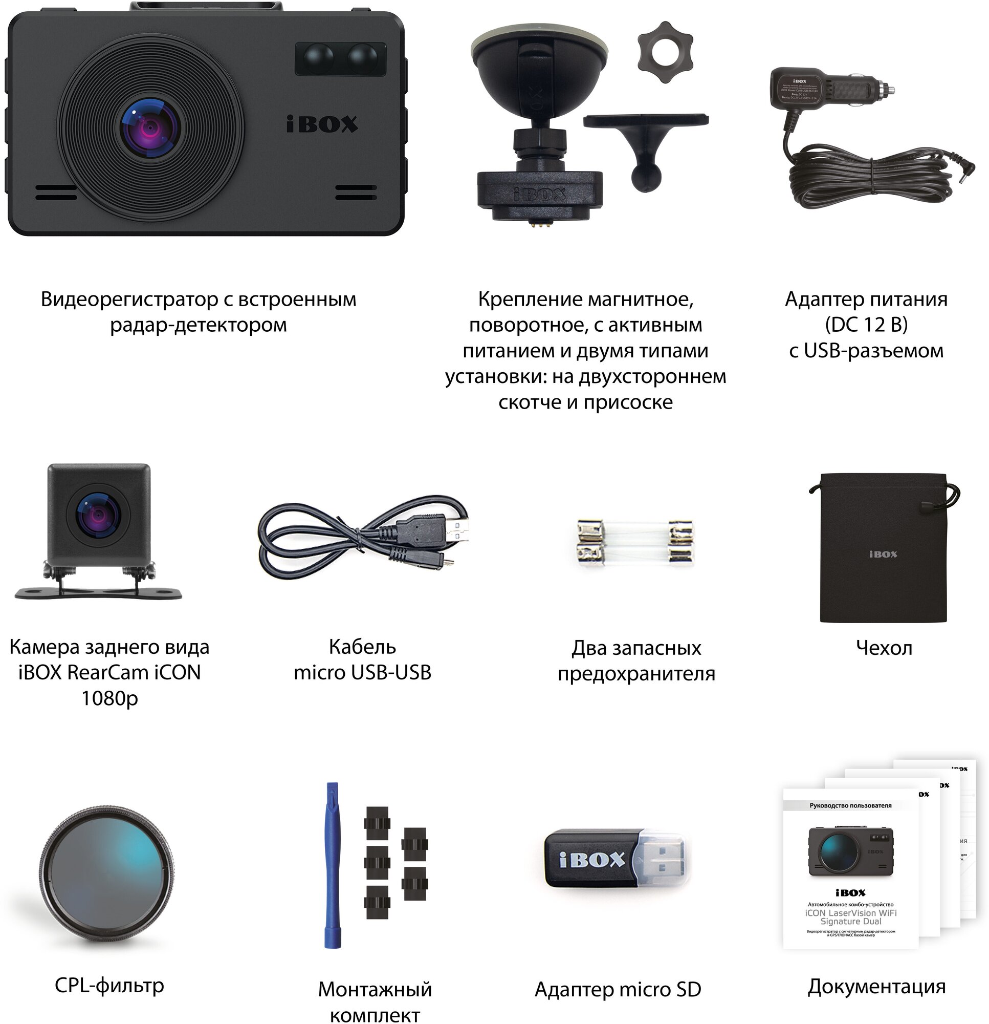Package contents: combo device, second camera, suction cup mount, 3M adhesive mount, power adapter, USB cable, micro SD adapter, case, CPL filter, 3M adhesive tape, installation kit, fuses, documentation