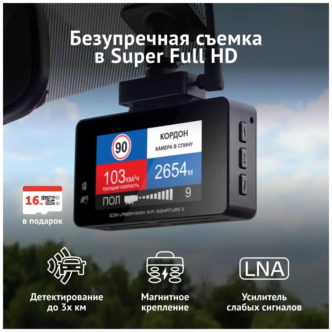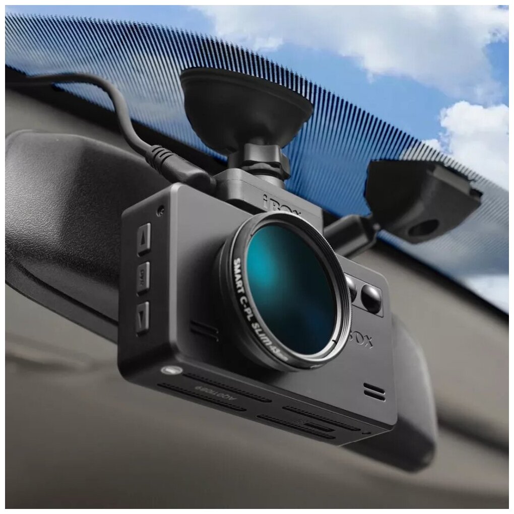 Complete set: iCON LaserVision WiFi Signature S, magnetic mount with two types of installation: on 3M adhesive tape and suction cup, adapter with a wire for connecting DC 12-24 V, fuses for the power adapter, adapter for micro SD memory card, CPL filter,
