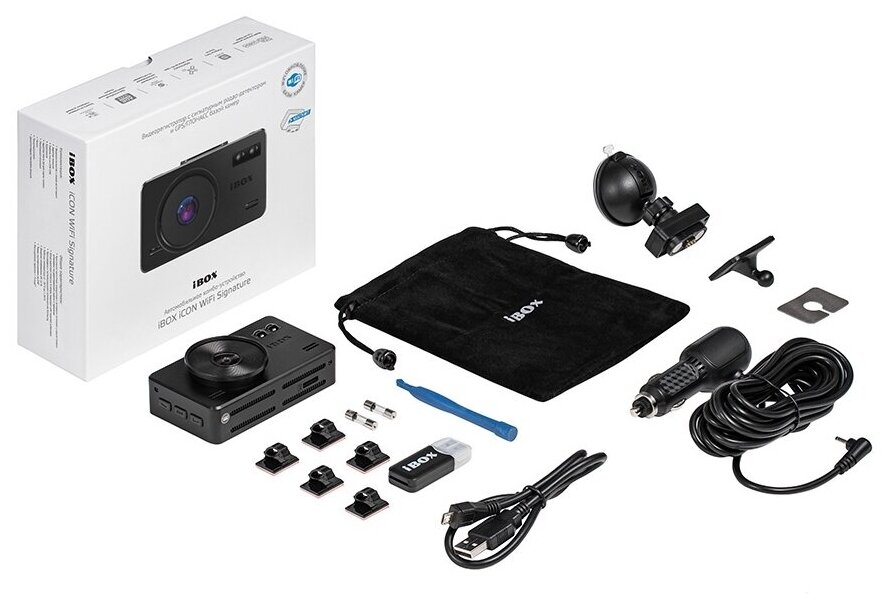 Complete set: combo device, magnetic mount with active power supply, DC 12-24 V power adapter, adapter for micro SD memory card, installation kit, USB cable, spare 3M adhesive tape, case, user manual, user manual