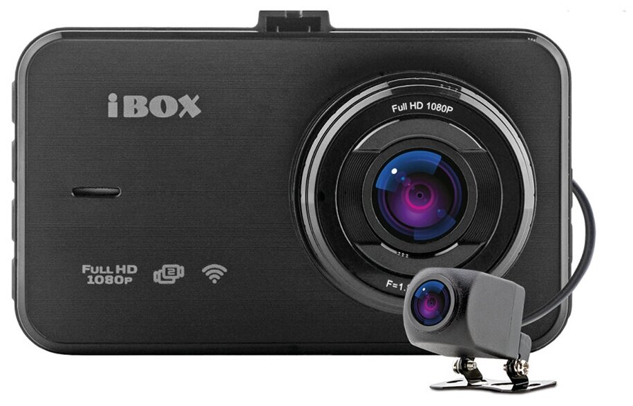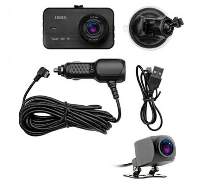 Equipment: iBOX Optic WiFi Dual, iBOX RearCam HD7 rear view camera, windshield mount, DC 12-24V power cable, USB cable, user manual, warranty card, user memo.