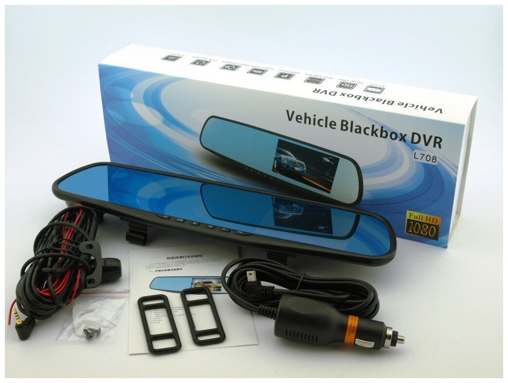 Complete set: Video recorder mirror, power cable to the cigarette lighter, rear view camera with cable, mounts on the rear view mirror, English instruction