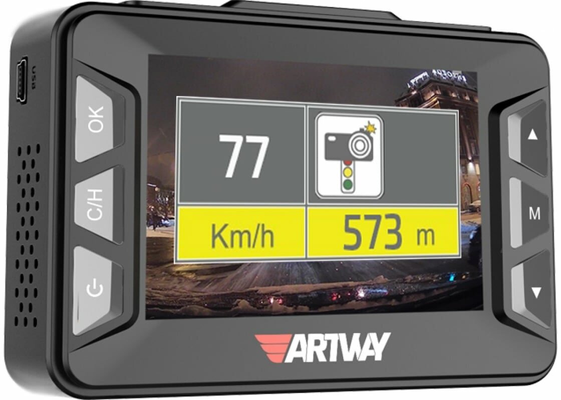 Magnetic mount; power supply through the bracket; operating modes of the radar detector - City / Highway / Auto; satellite signal range 575.42 GHz ± 1.023 MHz; radar detection ranges - X-band 10425-10625 MHz, K-band 24050-24250 MHz, Ka-band 33400-36000 MH