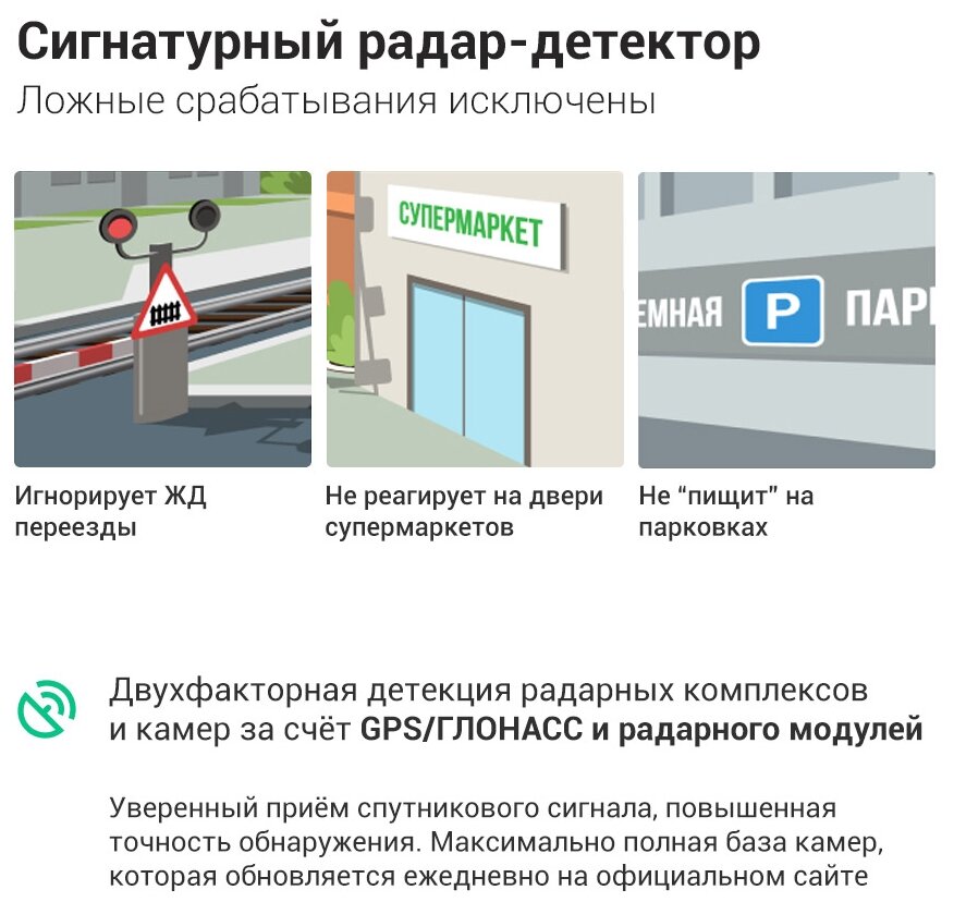 Received bands - K 24050-24250 MHz / X 10475-10575 MHz / Laser / Arrow; radar detection - Robot / Avtodoria / Avtohuragan / Arena / Cordon / Gyrfalcon / Chris / Potok-S / Strelka / Strelka-ST,M; operating modes - Auto / City / Signature / Highway; updatin