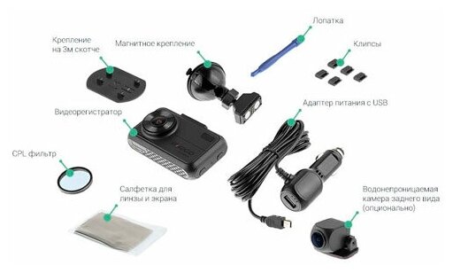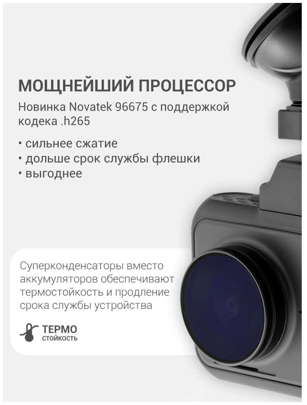 Radar detector, speedcam, max. video recording resolution: 2304×1296, design: normal, number of cameras: 2, shock sensor G-sensor, screen, viewing angle diagonal: 170 °, GLONASS, built-in microphone, Wi-Fi, recording mode: cyclic, processor: Novatek NTK 9