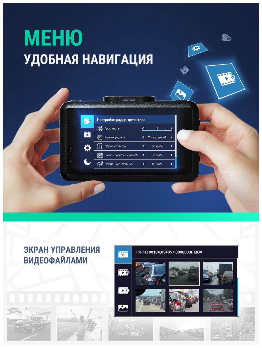 Voice alerts for 14 types of speed cameras; signature mode with protection against interference; 2-channel recording in FullHD; on-screen parking assistant when reversing