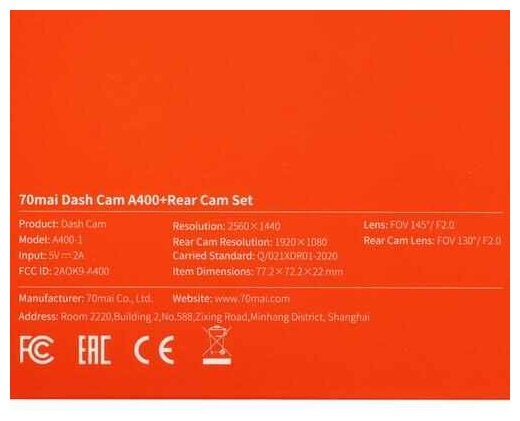 70mai Dash Cam A400 + Rear Cam Set A400-1 Red