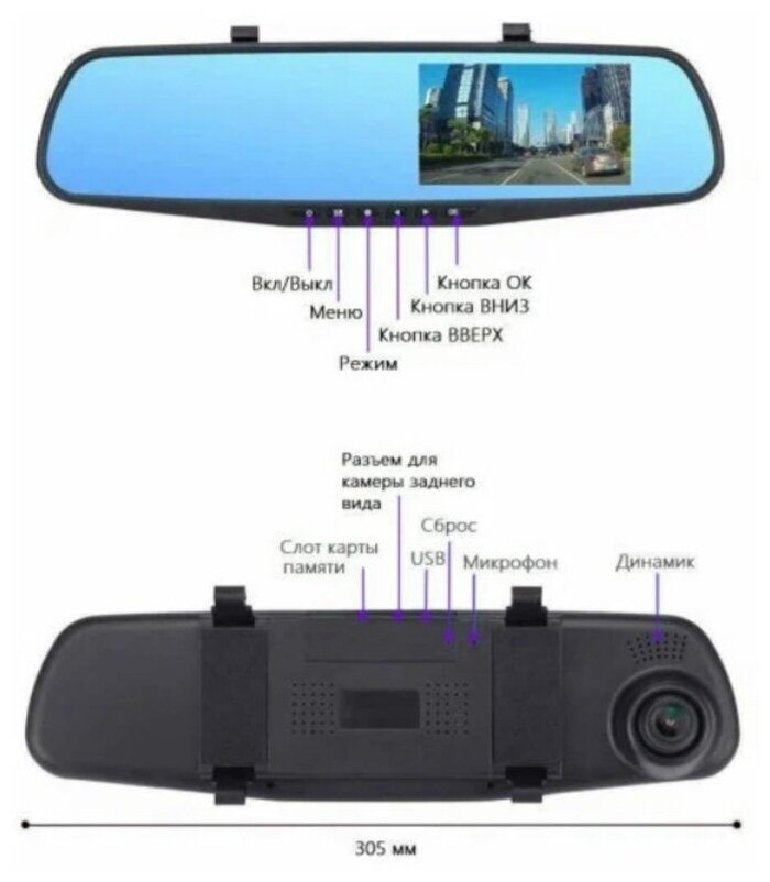 Max. video recording resolution: 1920×720, design: rearview mirror, number of cameras: 2, screen, built-in microphone, recording mode: continuous, night mode, time and date recording