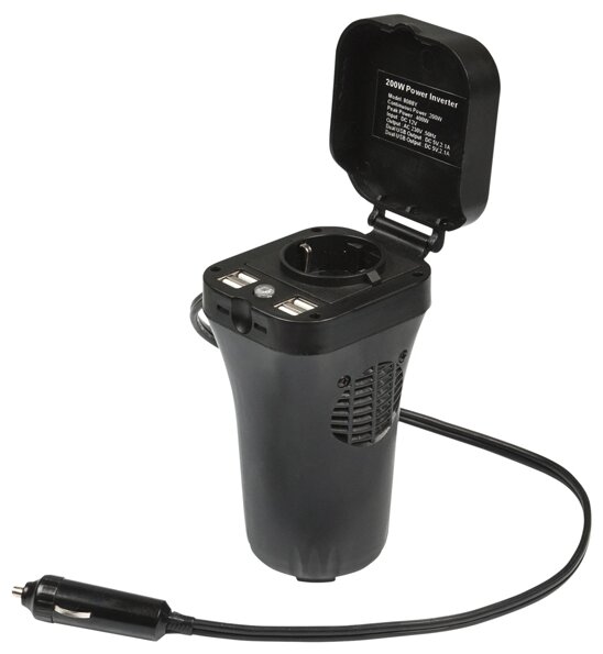 Inverter, 200 W, waveform: approximate sine wave, battery connection: cigarette lighter, input. voltage: 12V output. voltage: 220V, short circuit protection
