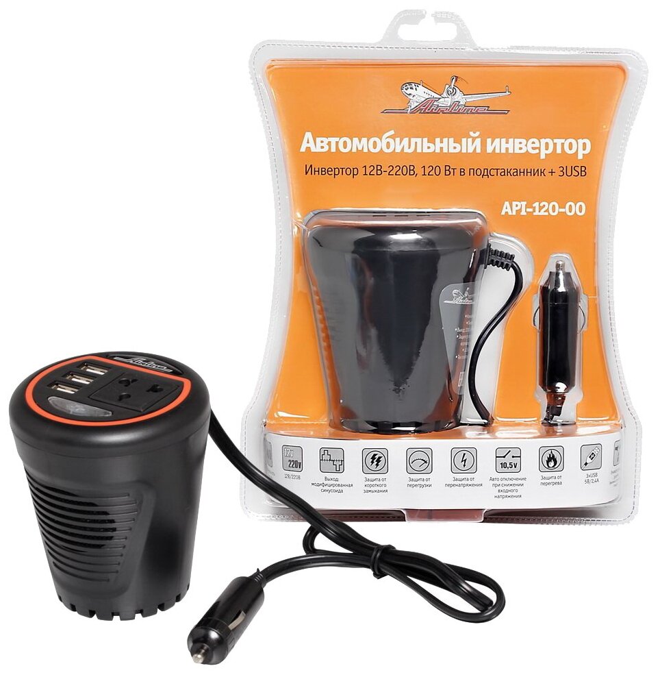 Inverter, 120 W, waveform: approximate sine wave, 3 USB, battery connection: cigarette lighter, input. voltage: 12V output. voltage: 220V, short circuit protection, over temperature protection, overvoltage protection