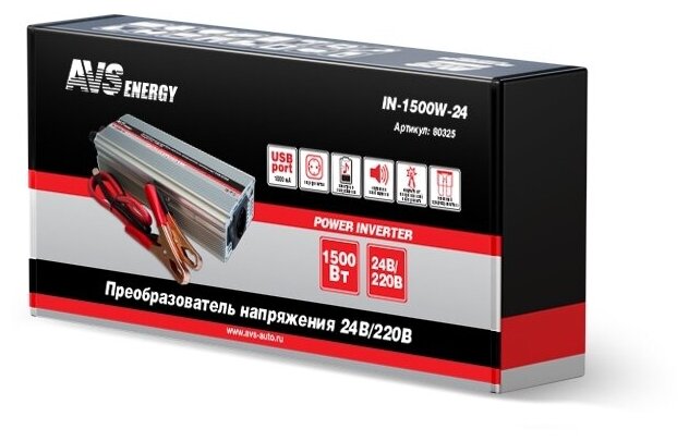 Description: Inverter, 1500 W, waveform: approximate sine wave, 1 USB, battery connection: alligator clips, cigarette lighter, input. voltage: 24V output. voltage: 220V, short circuit protection, reverse polarity protection, over temperature protection, overvoltage pr