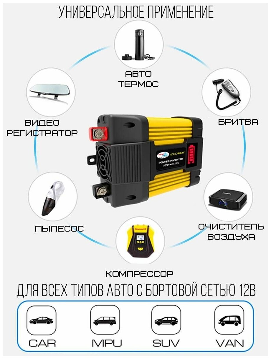 Inverter, 300 W, waveform: approximate sine wave, 2 USB, battery connection: cigarette lighter, input. voltage: 12V, 14V output. voltage: 220V, short circuit protection, over temperature protection, overload protection, overvoltage protection, low battery