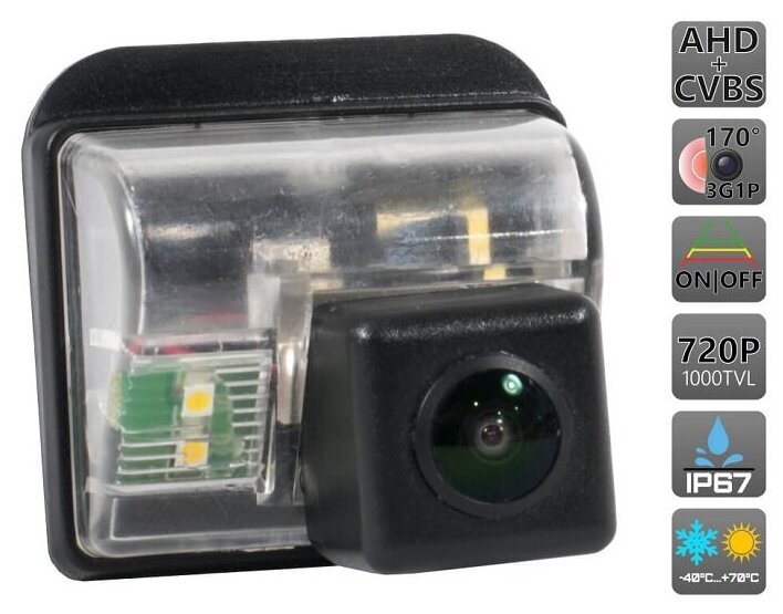 Type: rear view, camera, camera type: rear view, camera, camera installation: stock, car brand: Mazda, features: auto white balance, auto exposure, mirroring, parking lines