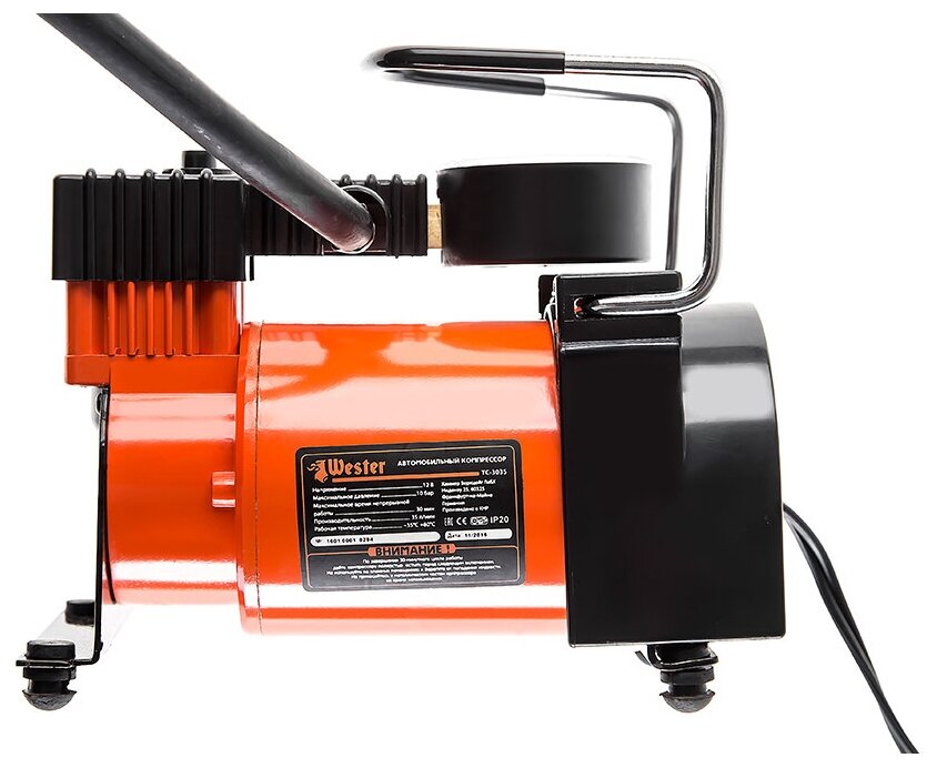 Power supply: from the cigarette lighter socket, voltage: 12 V, inlet capacity: 35 l/min, power: 160 W, maximum pressure: 10 atm, compressor type: piston, power cable length: 2.50 m, air hose length: 0.75 m, ma