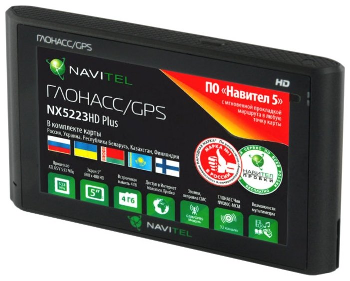 Navigator, car holder for the car panel and windshield, 220V mains charger and charging from the car cigarette lighter, USB cord, stylus, protective, leatherette case, Navitel map Russia, Ukraine, Belarus, Kazakhstan, Finland.