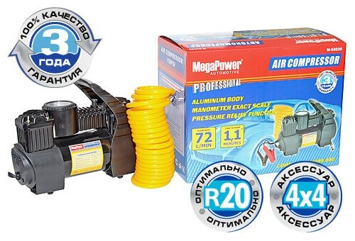 Power supply: from the battery terminals, From the car 12V battery, voltage: 12 V, input capacity: 72 l/min, power: 200 W, maximum pressure: 10 atm, compressor type: piston, power cable length
