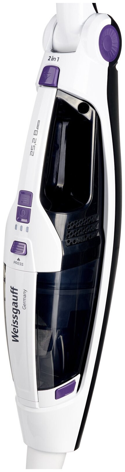 Cleaning type: dry, power supply: battery, battery life: 60 min, battery type included: Li-Ion, detachable hand vacuum cleaner, accessories: crevice nozzle, electric brush, height: 121 cm, weight: 2.70 kg