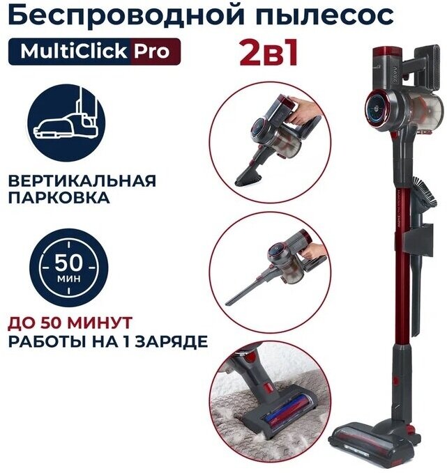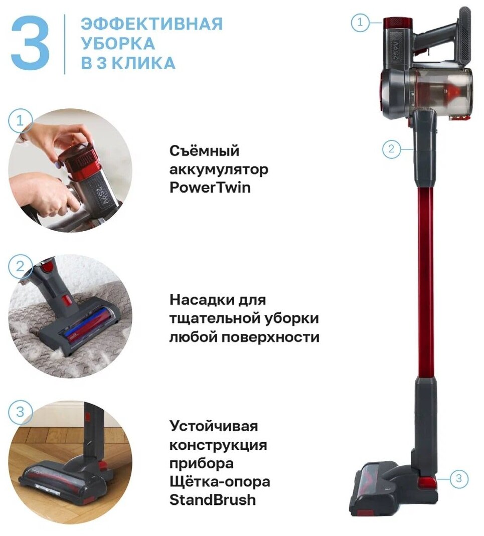 Three operating modes: Eco mode up to 50 minutes without recharging, basic mode up to 25 minutes, Turbo mode up to 15 minutes; suction power: 12,000, 17,000 and 24,000 Pa; tube material: metal; Body material: ABS plastic, aluminum; battery charging time