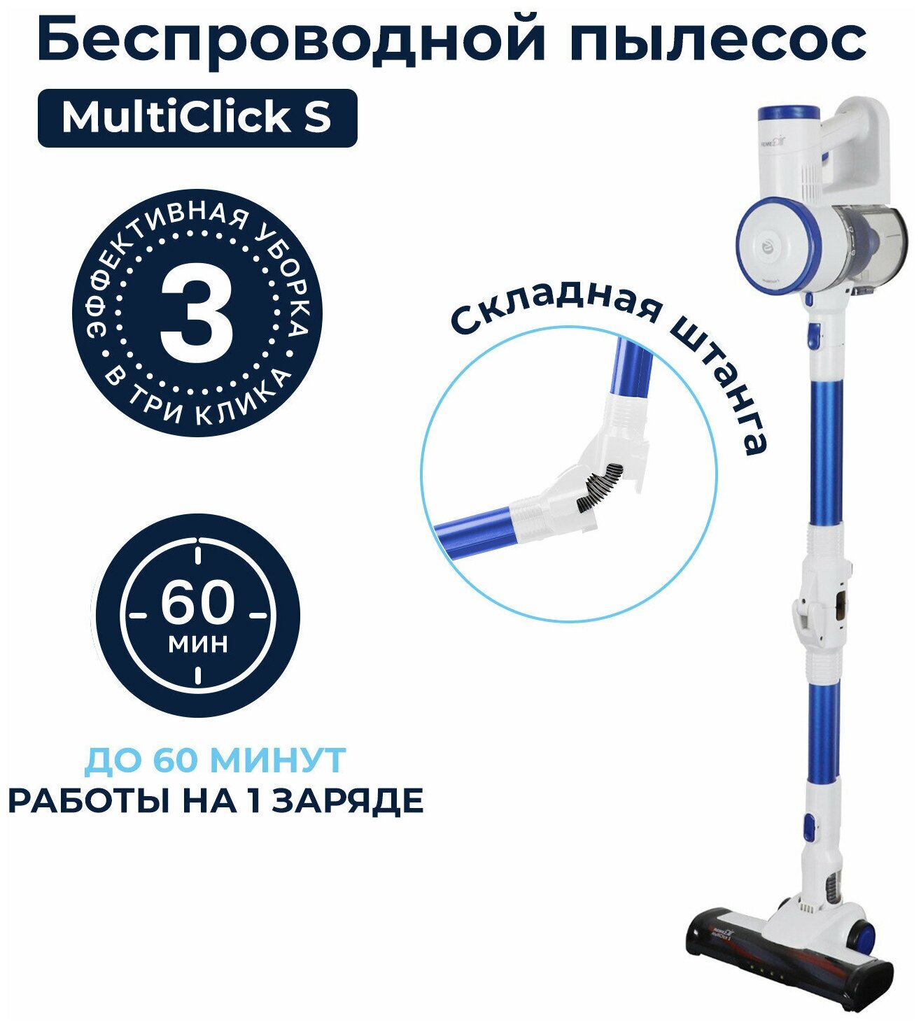 Cleaning type: dry, power type: battery, battery life: 60 min, battery type included: Li-Ion, additional functions: the ability to connect an electric brush, cleaning area lighting, features to