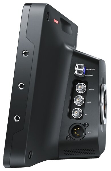10.1 TFT-LCD display, active MFT mount, 2 x 3/8 mounting holes for tripod mounting. 4 x 1/4 20 UNC threads on the top panel. 3 x 1/3 20 UNC left to right, one 12G-SDI input, one sync input, fiber