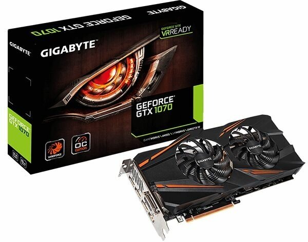 Graphics card name: NVIDIA GeForce GTX 1070, video memory size: 8 GB, graphics card developer: NVIDIA, product line: GeForce, memory type: GDDR5, memory bus width: 256 bit, gaming, PCI Express version: 3.0, Number of HDMI outputs: 1, Output display port