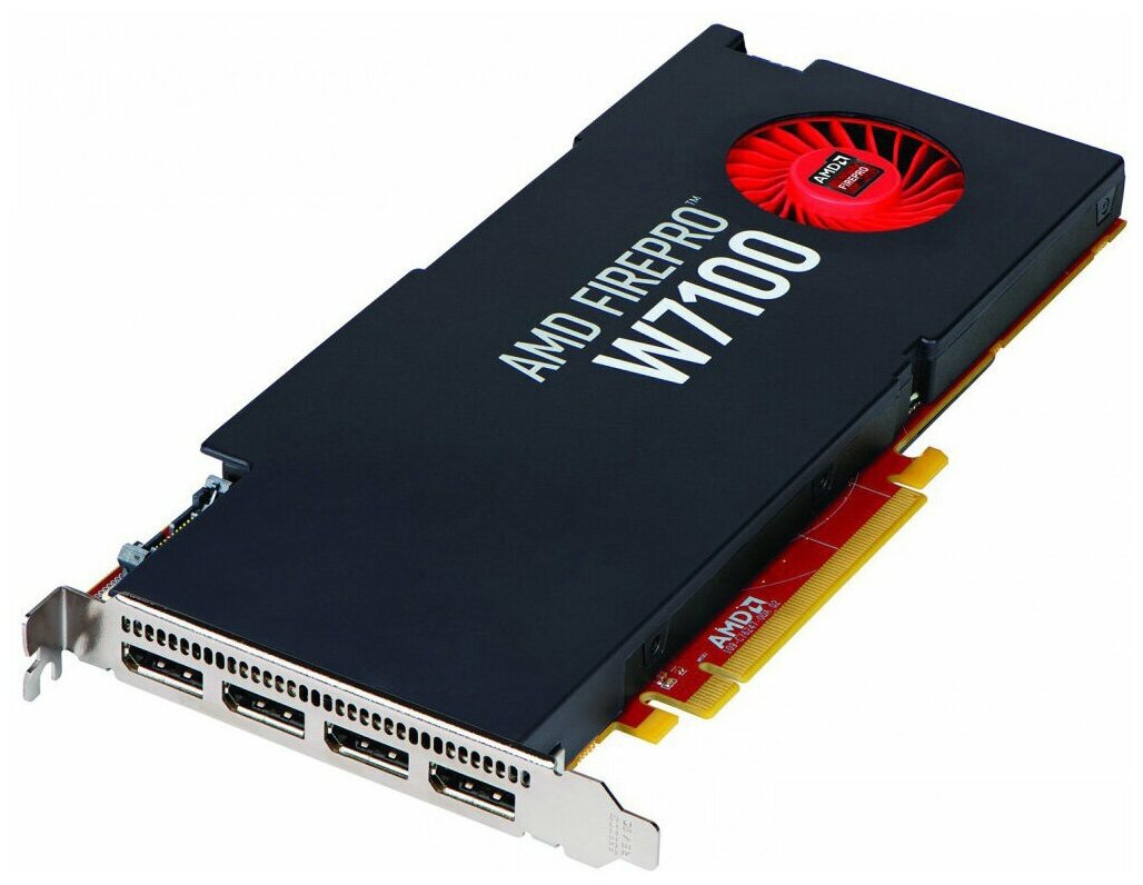 Graphics card name: AMD FirePro W7100, video memory size: 8 GB, graphics card manufacturer: AMD, product line: FirePro, memory type: GDDR5, memory bus width: 256 bit, PCI Express version: 3.0, DisplayPort output